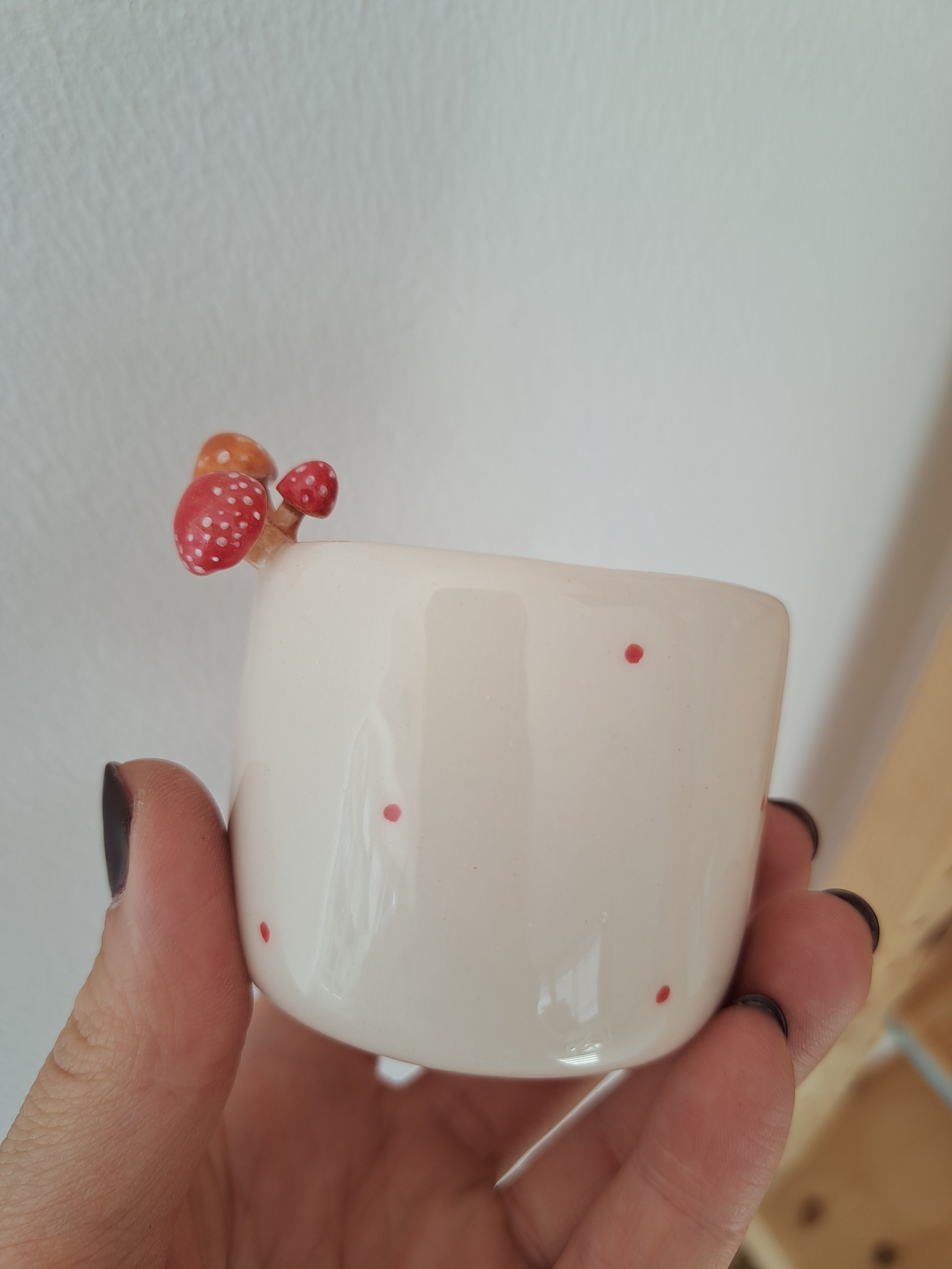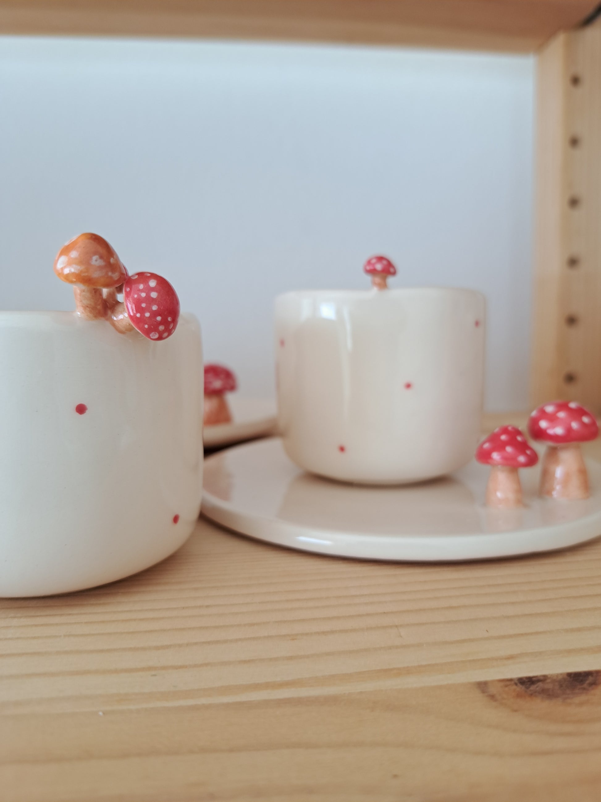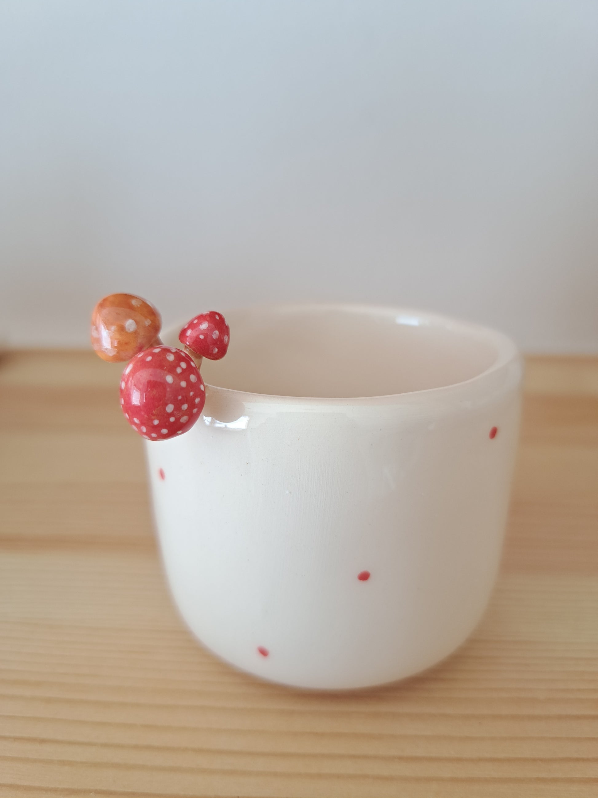 Chávena com aplicação de 3 cogumelos no rebordo.