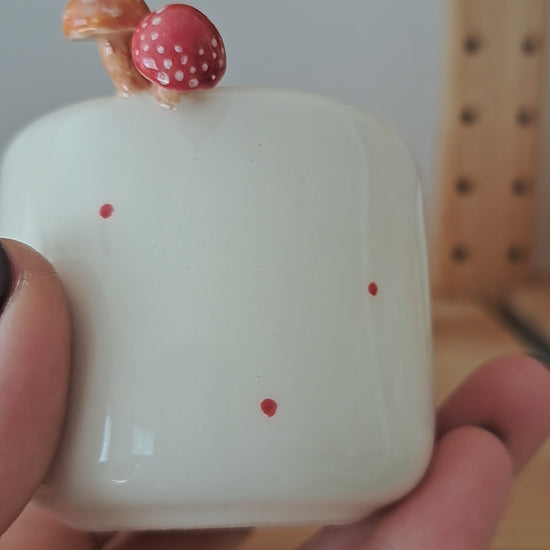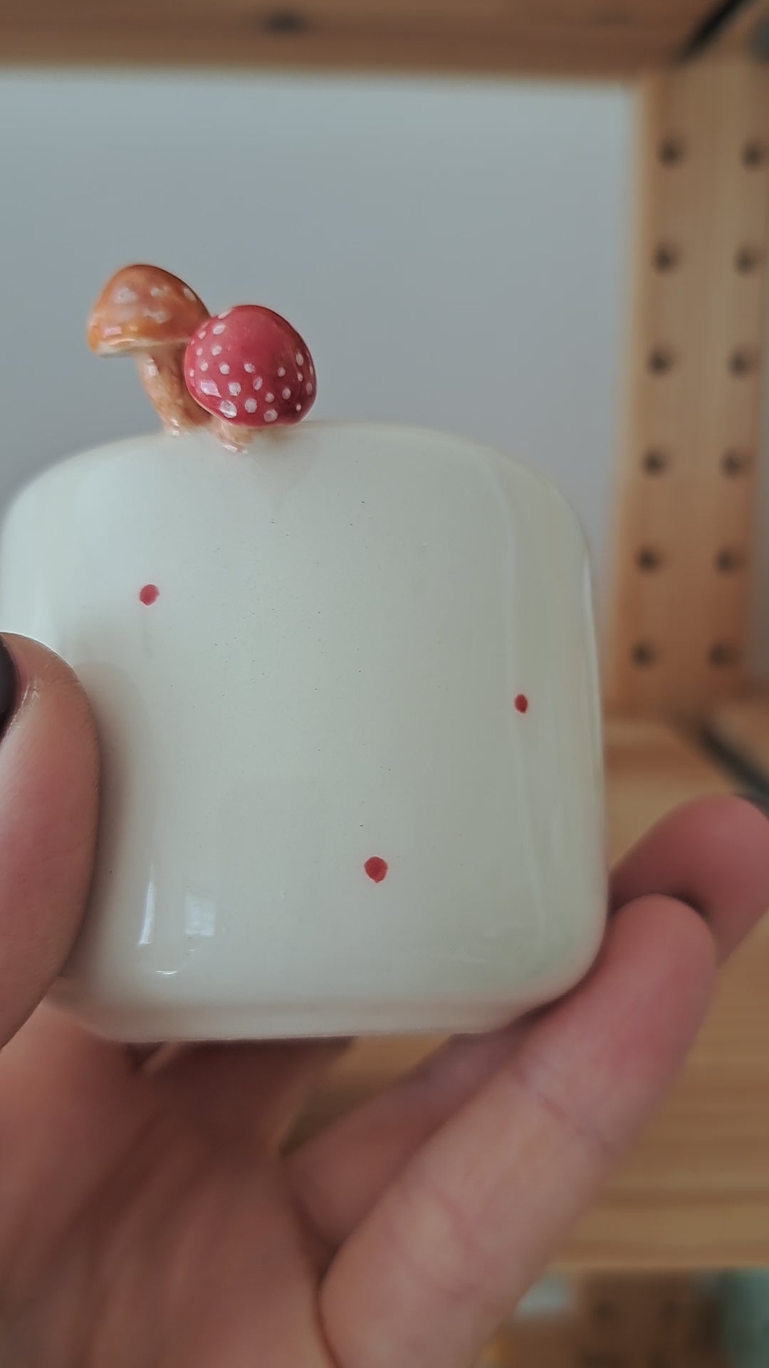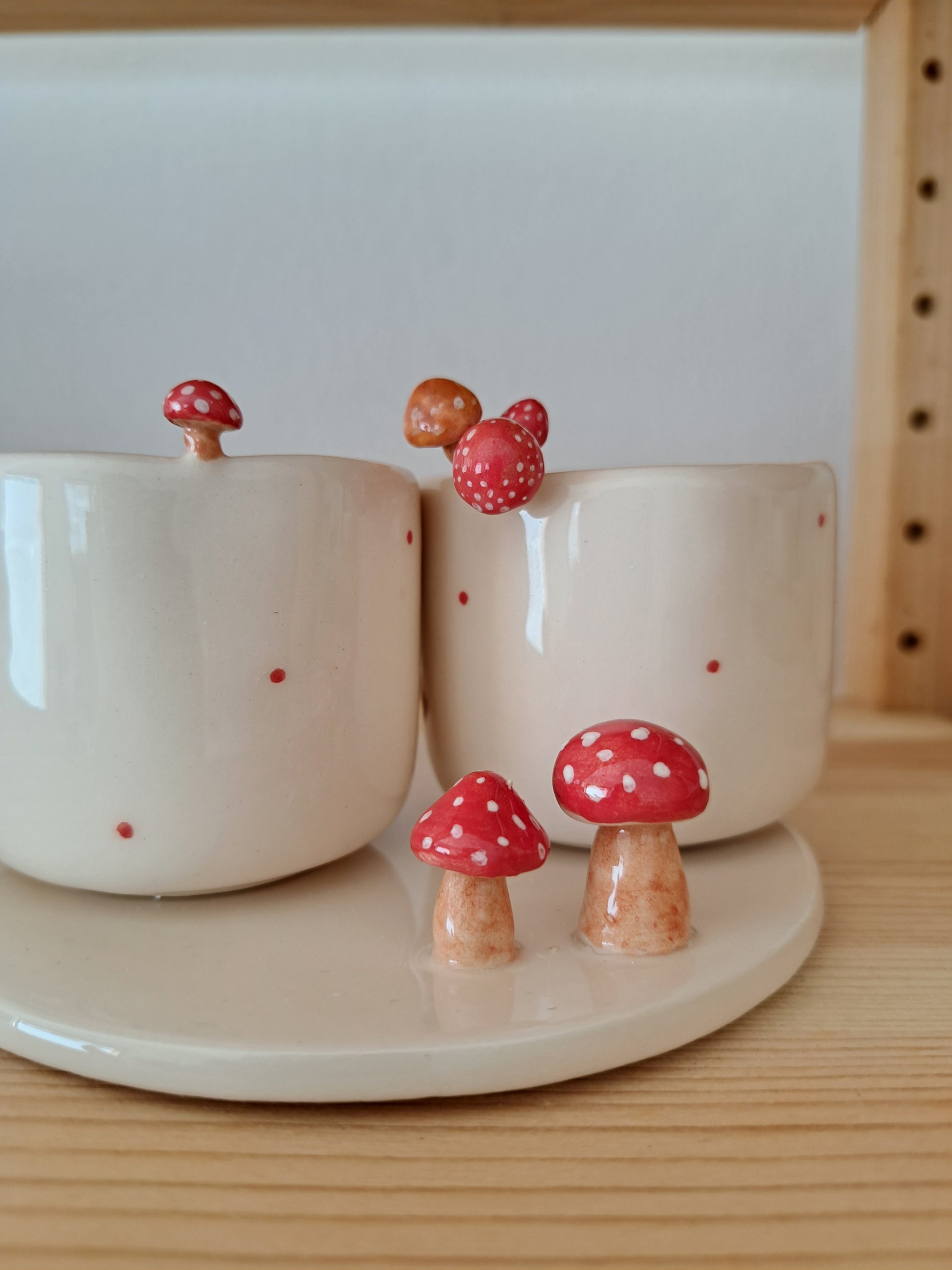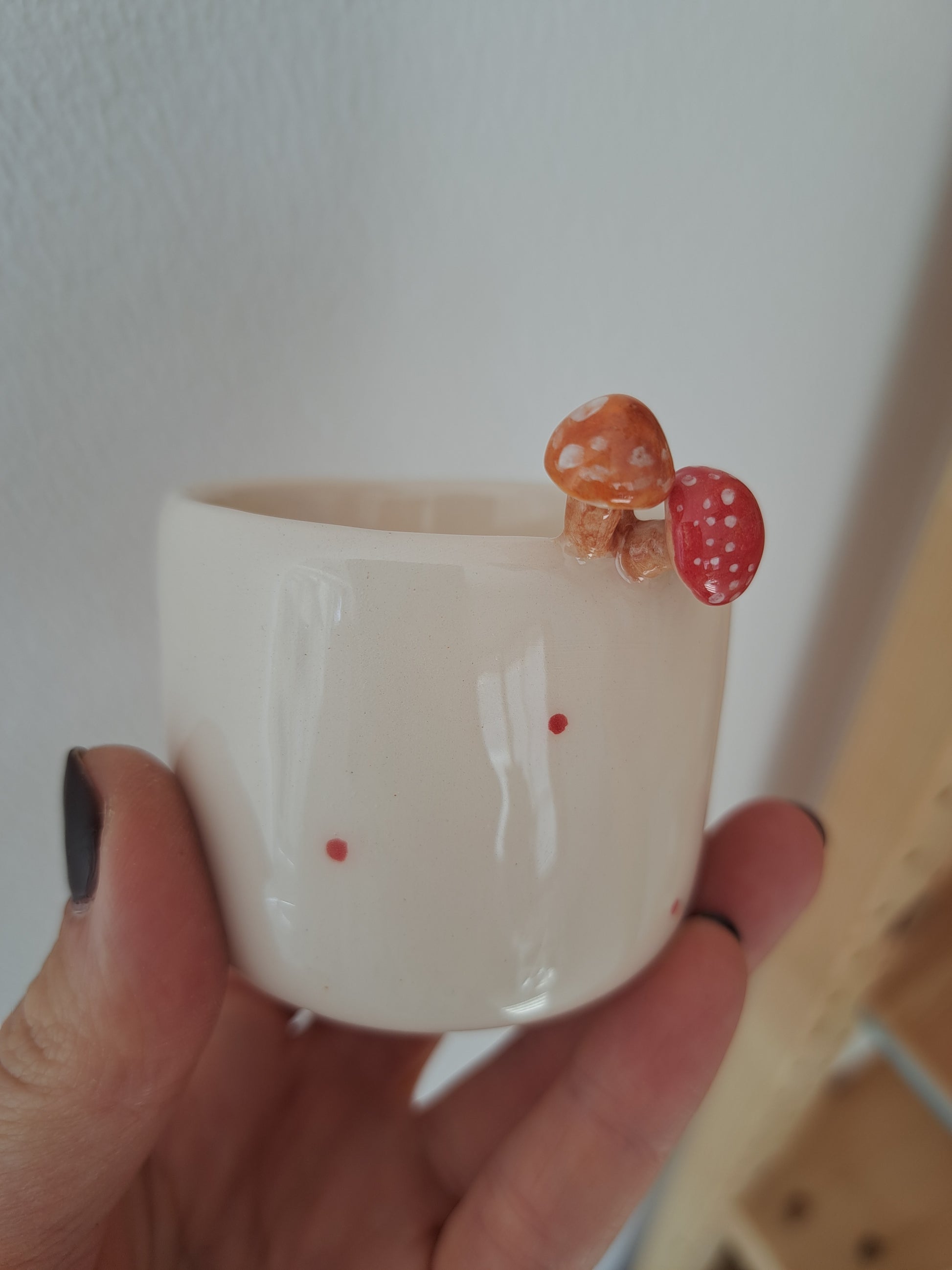 Chávena com aplicação de 3 cogumelos no rebordo.