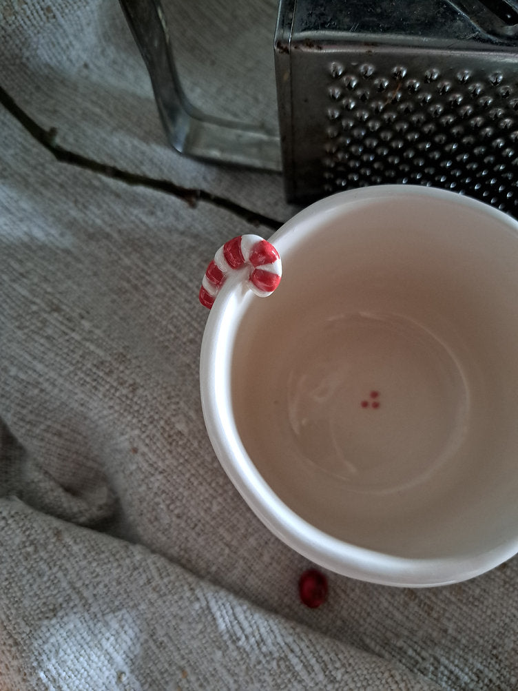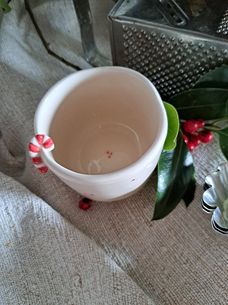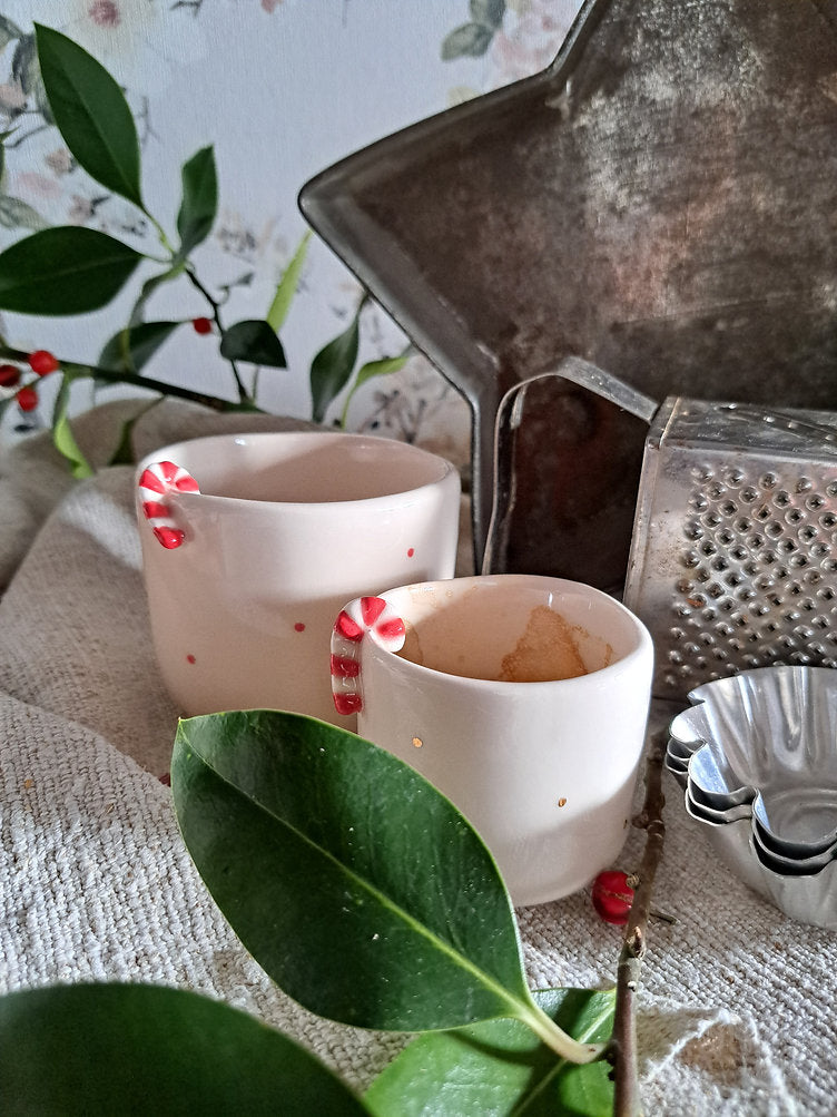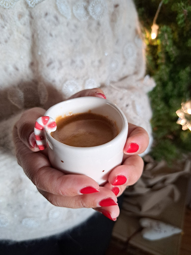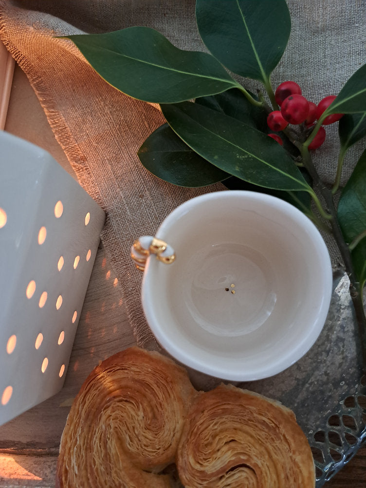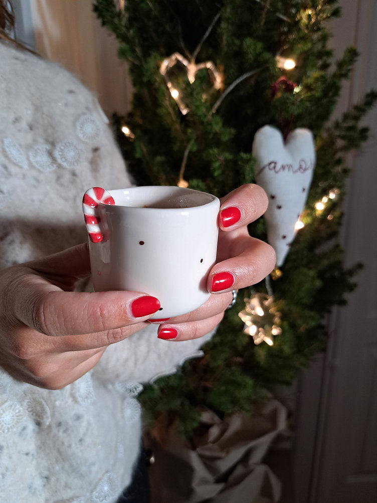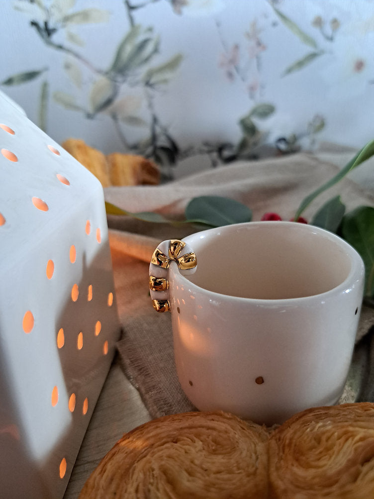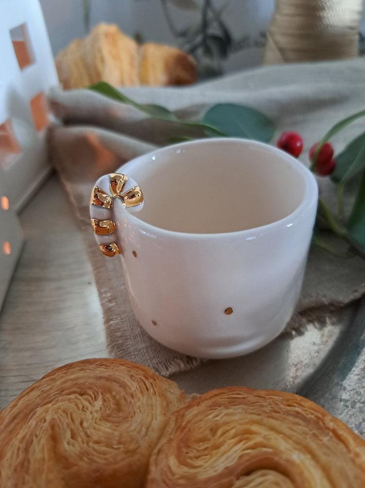 Chávena com aplicação da bengala no rebordo e pintas vermelhas ou detalhes em ouro de 8k no exterior .