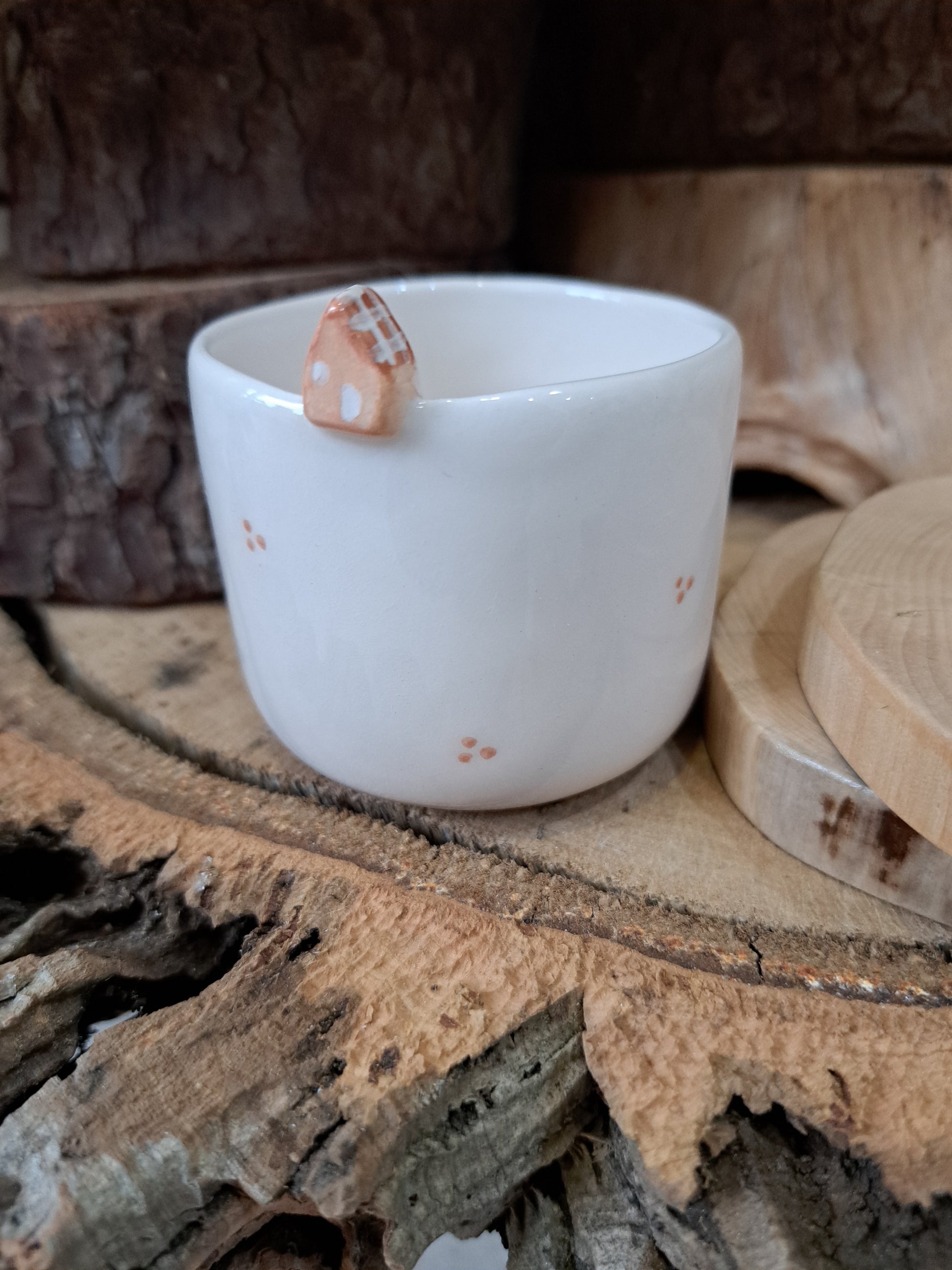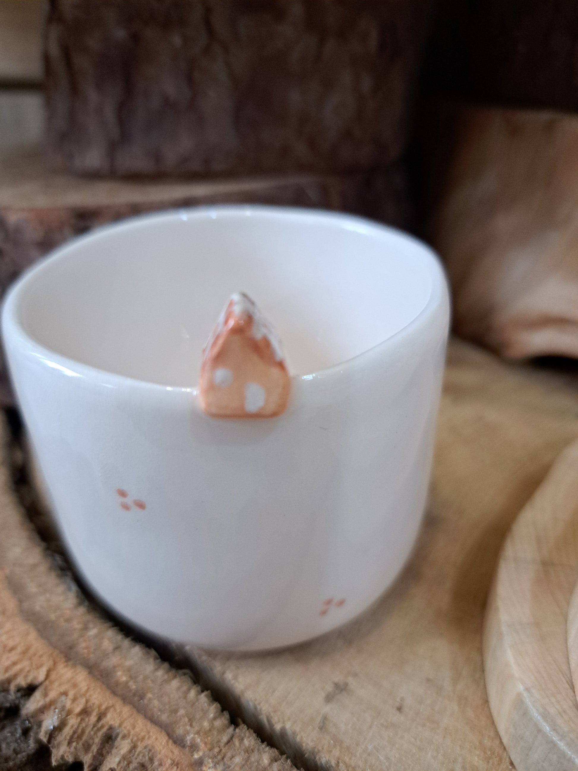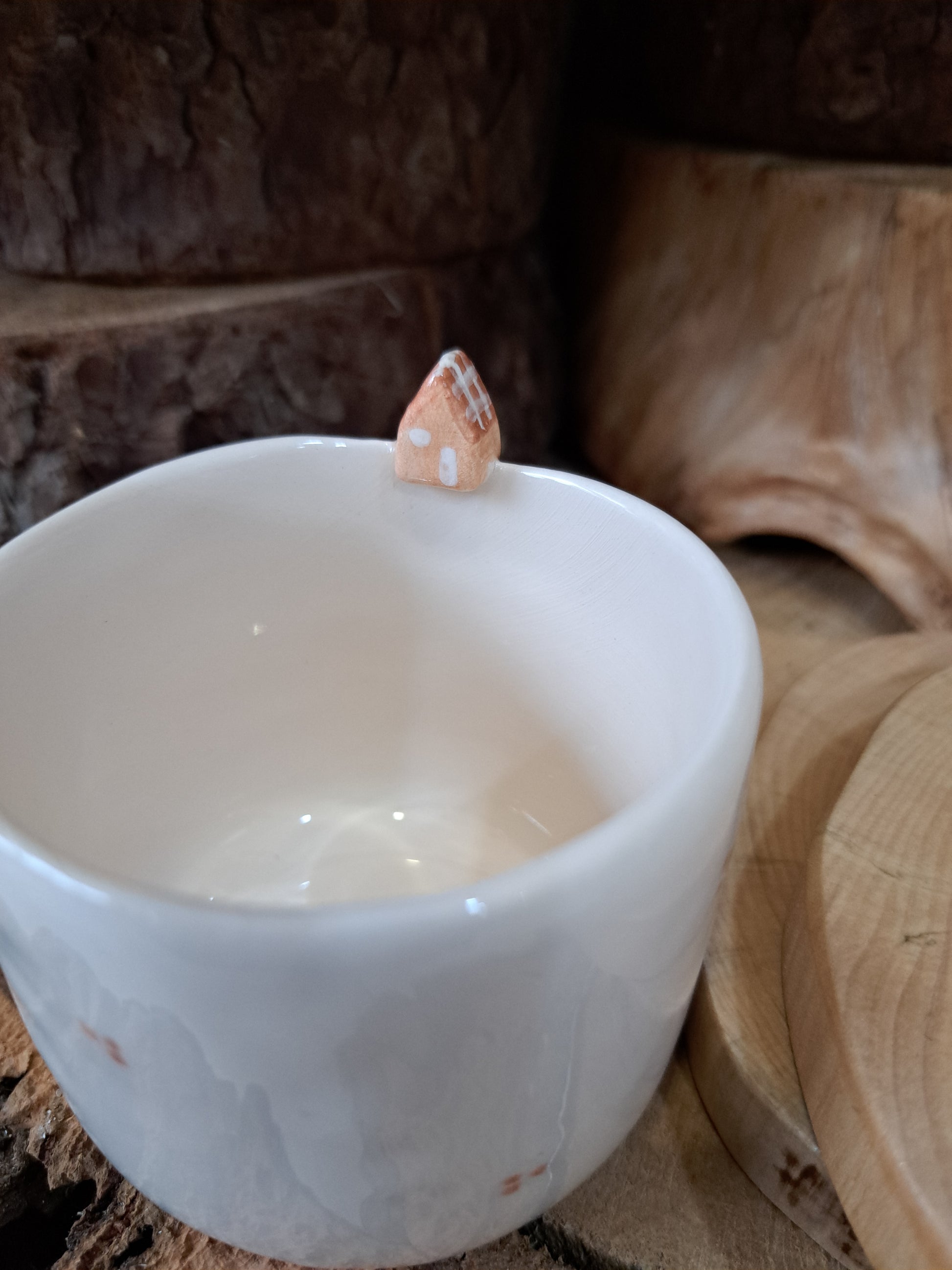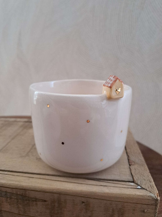 Chávena com aplicação de cookie house no rebordo + pintas ou detalhes em ouro de 8k.