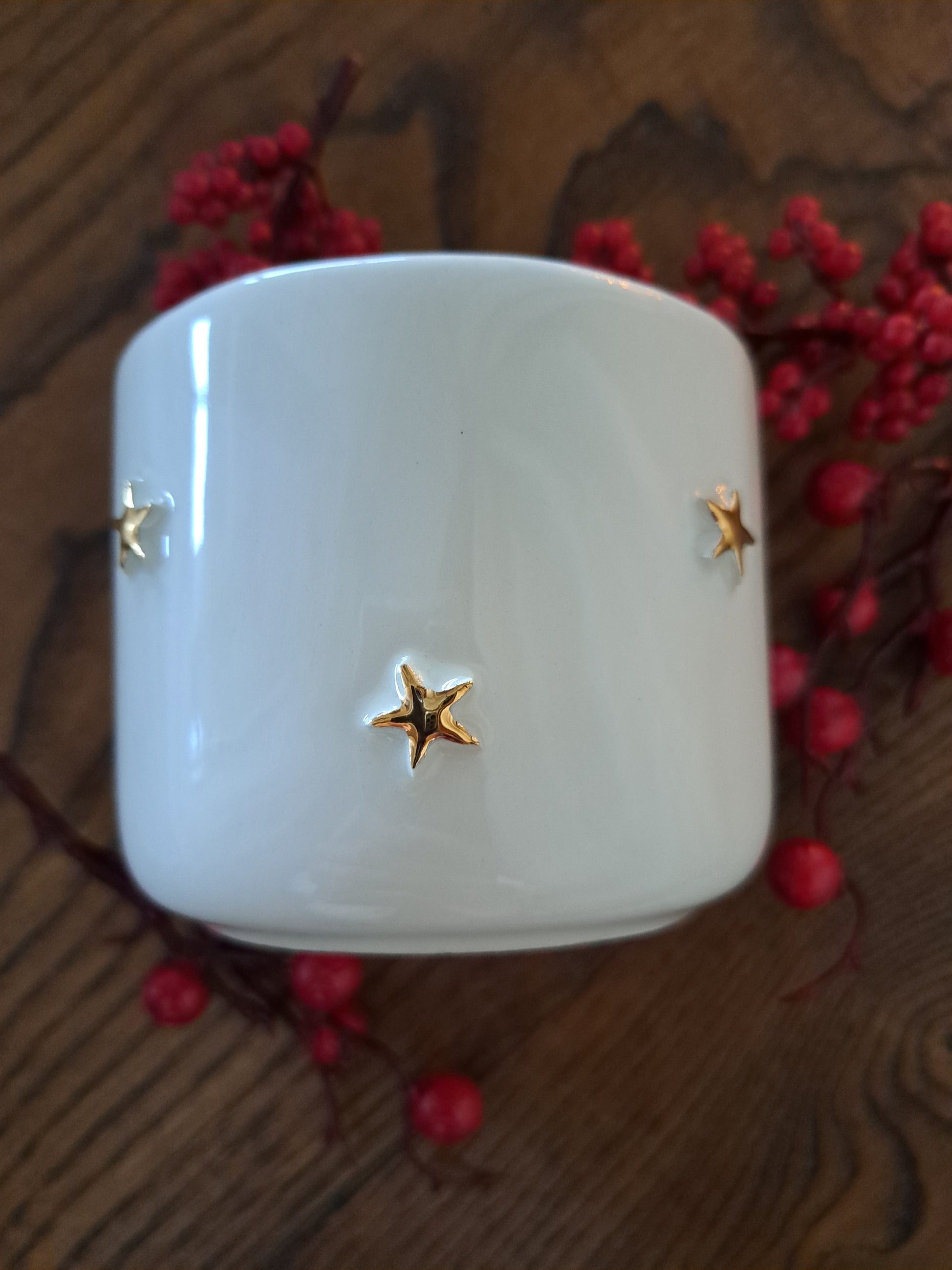 Chávena com aplicação de pequenas estrelas em relevo, disponível na versão branca ou pintadas com ouro de 8k.