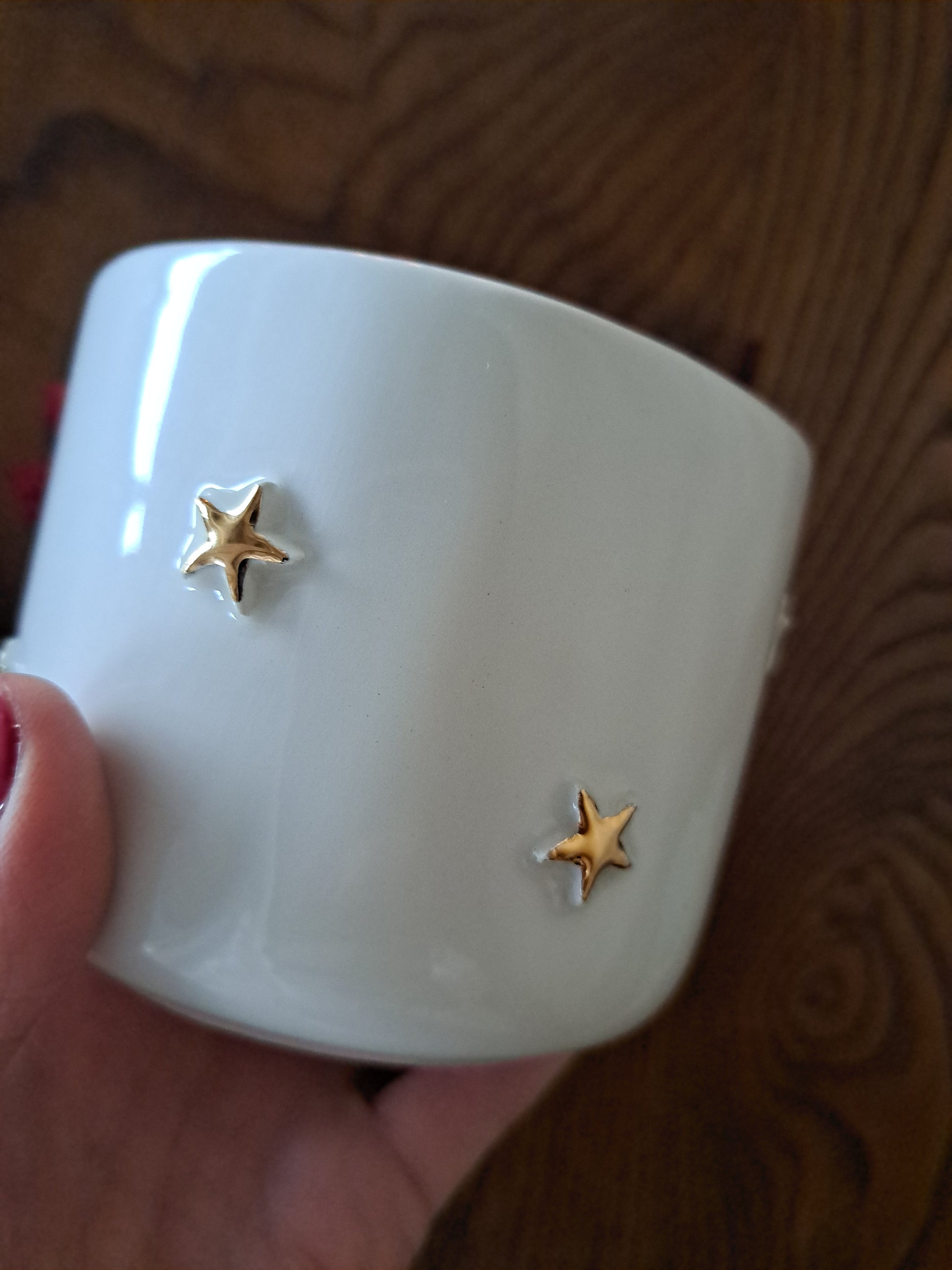 Chávena com aplicação de pequenas estrelas em relevo, disponível na versão branca ou pintadas com ouro de 10k.