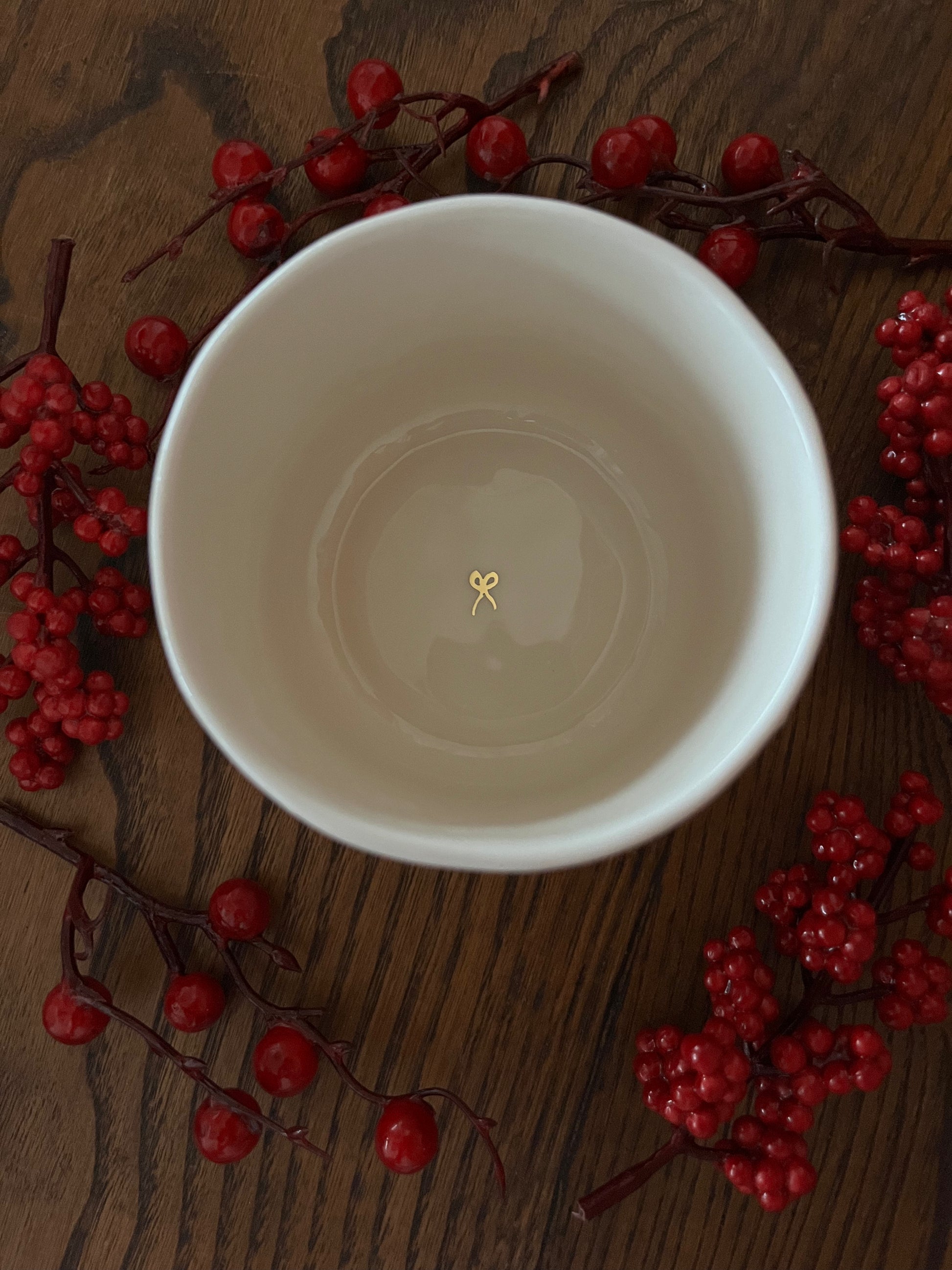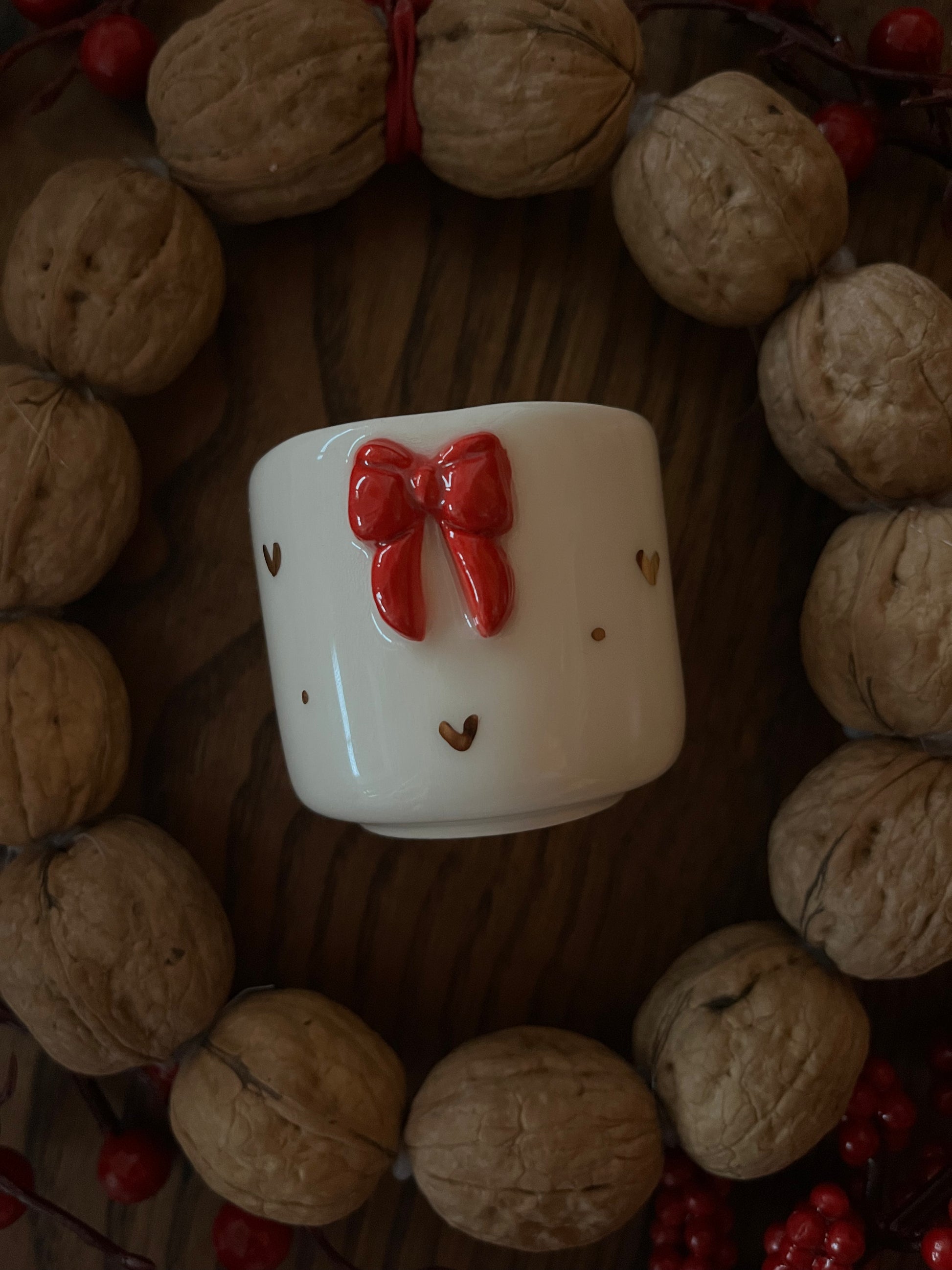 Chávena com aplicação de laço vermelho com detalhes em ouro de 8k.