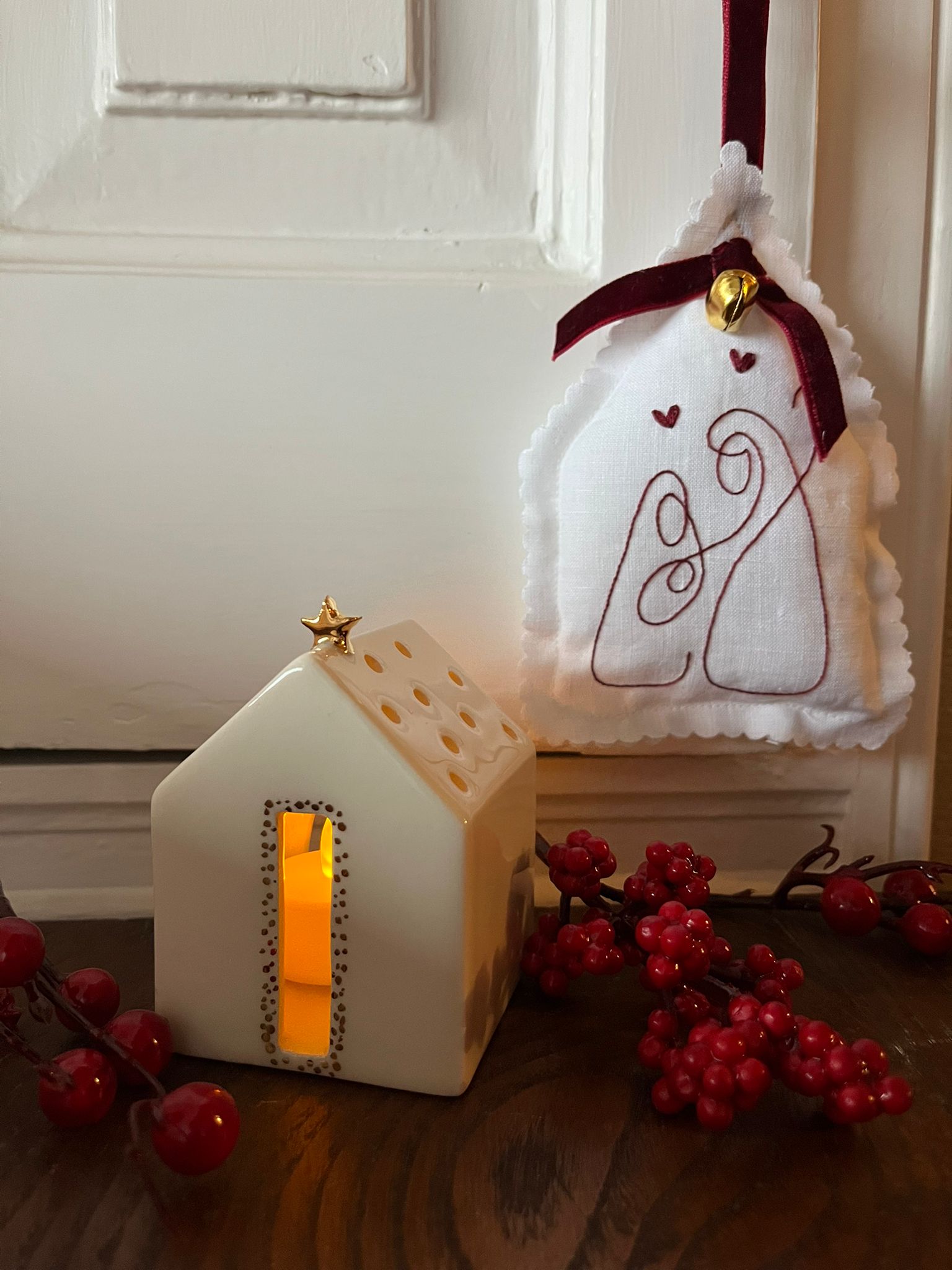 Pendente da Sagrada Família feito em linho e bordado na cor bordeaux, feito à mão pela querida Ana Handmade.